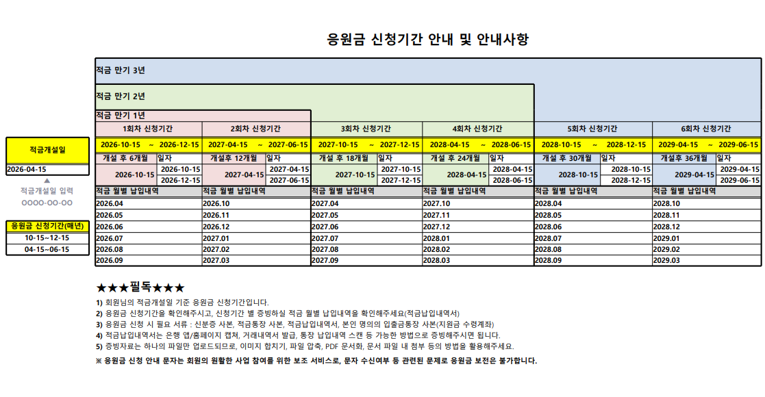 회원님의 적금 개설일을 입력하시면 응원금 신청기간 모의계산이 가능합니다.