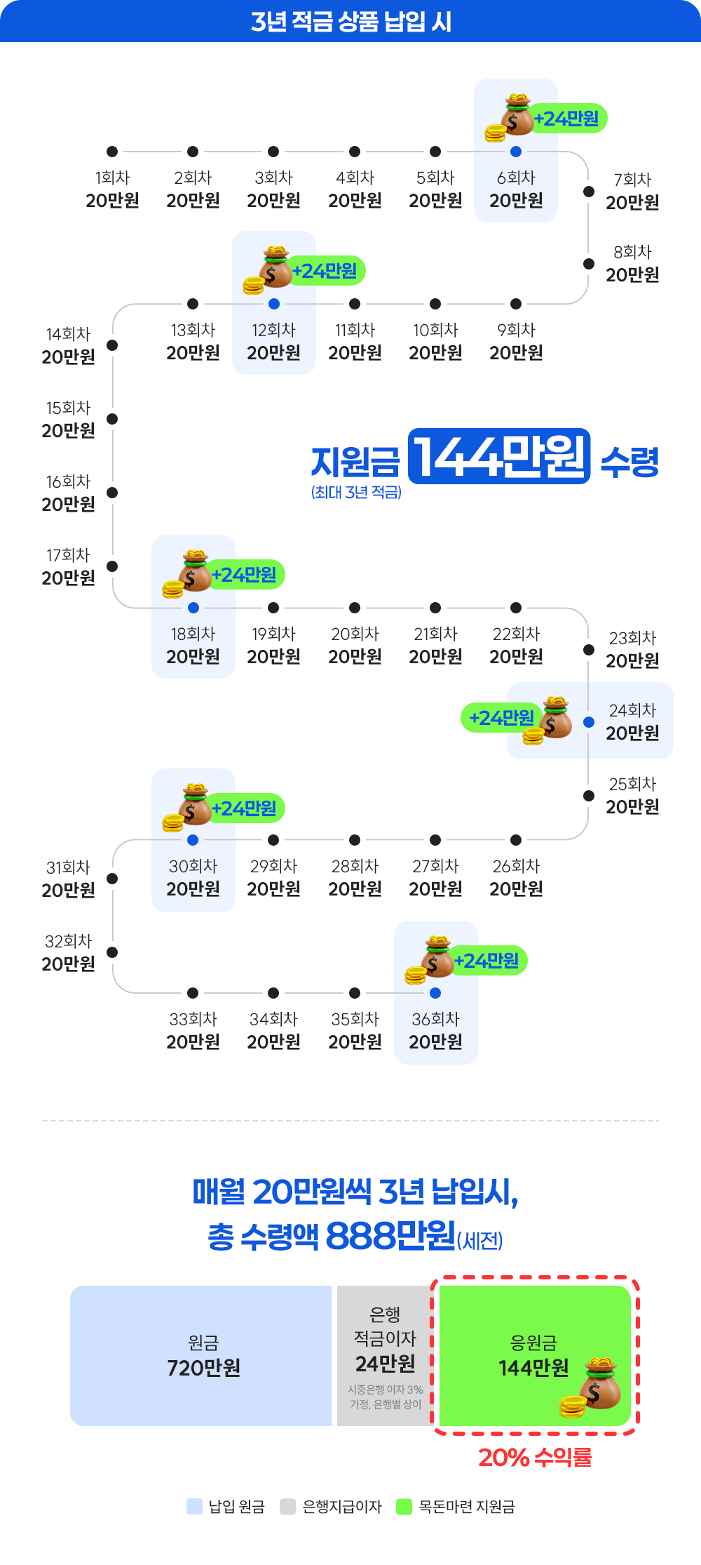 시중은행 적금상품에 가입 후 매월 20만 원씩 저축하면, 6개월마다 24만 원 씩,