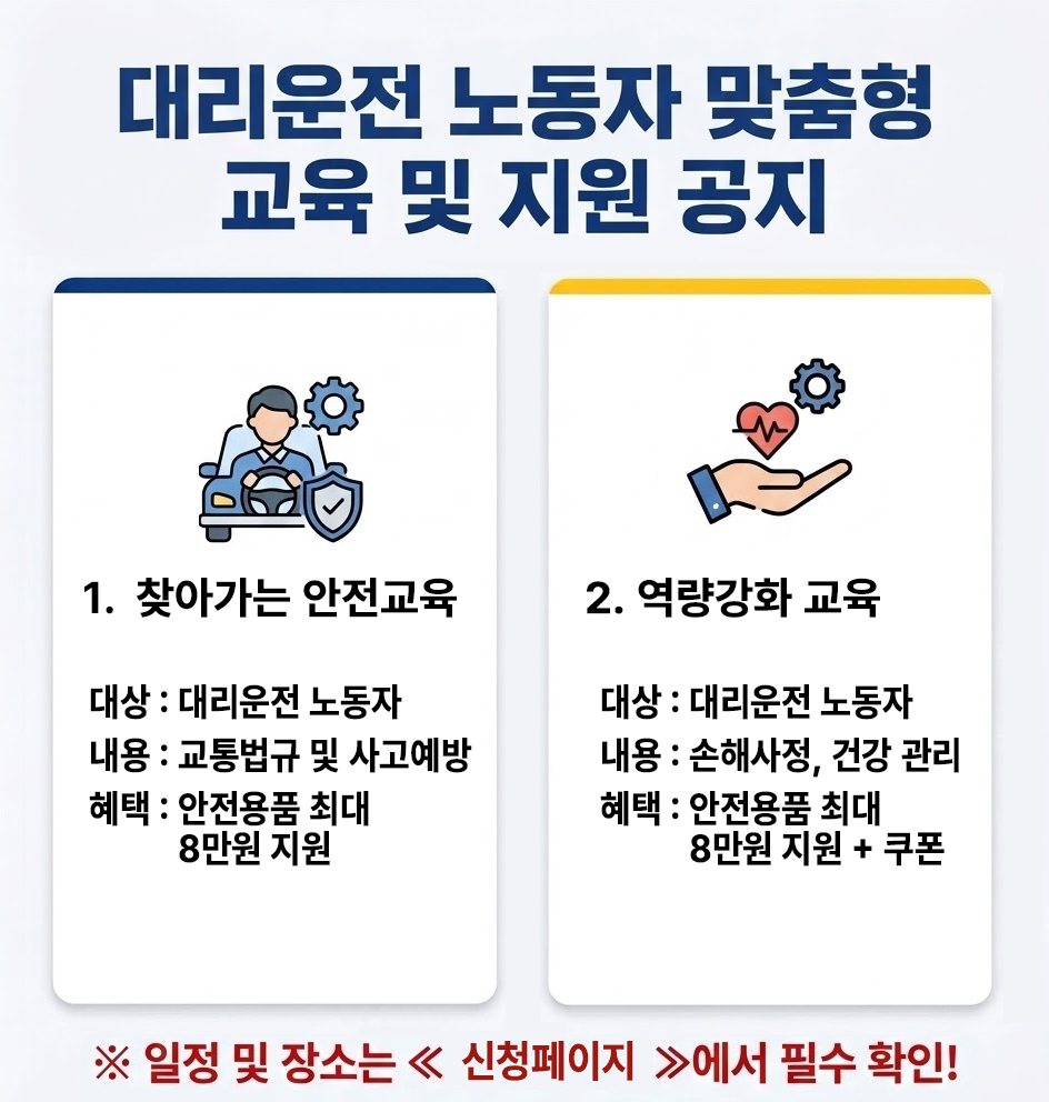교육대상 : 경기도 플랫폼노동자(대리운전 노동자) 교육주제 : 교통법규 기초, 사고 예방법, 사고시 대처 등 교육횟수 : 연간 2회 (교육일정표 참고) 교육시간 : 2시간 참가자 지원 ① 안전용품 구입 지원(최대 8만원) - 교육 이수 후 평가설문 제출 - 안전용품 구매 후 영수증 제출 ② 배달서비스공제조합 보험료 1년간 1% 할인 - 기존 가입자 : 배달서비스공제조합에서 확인 후 적용 - 신규 가입자 : 6개월 내 가입 시 적용 ※ 세부 교육일, 교육 장소, 교육 내용 등은 '교육 일정표'를 참고하시기 바랍니다. ※ 수강 참여 메세지를 받으신 분만 참여 가능합니다. ※ 교육 장소의 인원 수용 제한 또는 특정 지역 신청자가 많을 경우 선착순으로 조기에 신청 마감 될 수 있습니다. ※ 신청 마감 시 별도로 안내드리지 못하는 점 양해 부탁 드립니다. [신청시 유의사항] 찾아가는안전교육 수강 시 혜택(안전용품 구입지원금 및 배달서비스공제조합 보험료 할인)은 1인당 1회 지원됩니다. 중복 혜택지원은 불가능합니다. 확인하시어 신청 부탁 드립니다. |