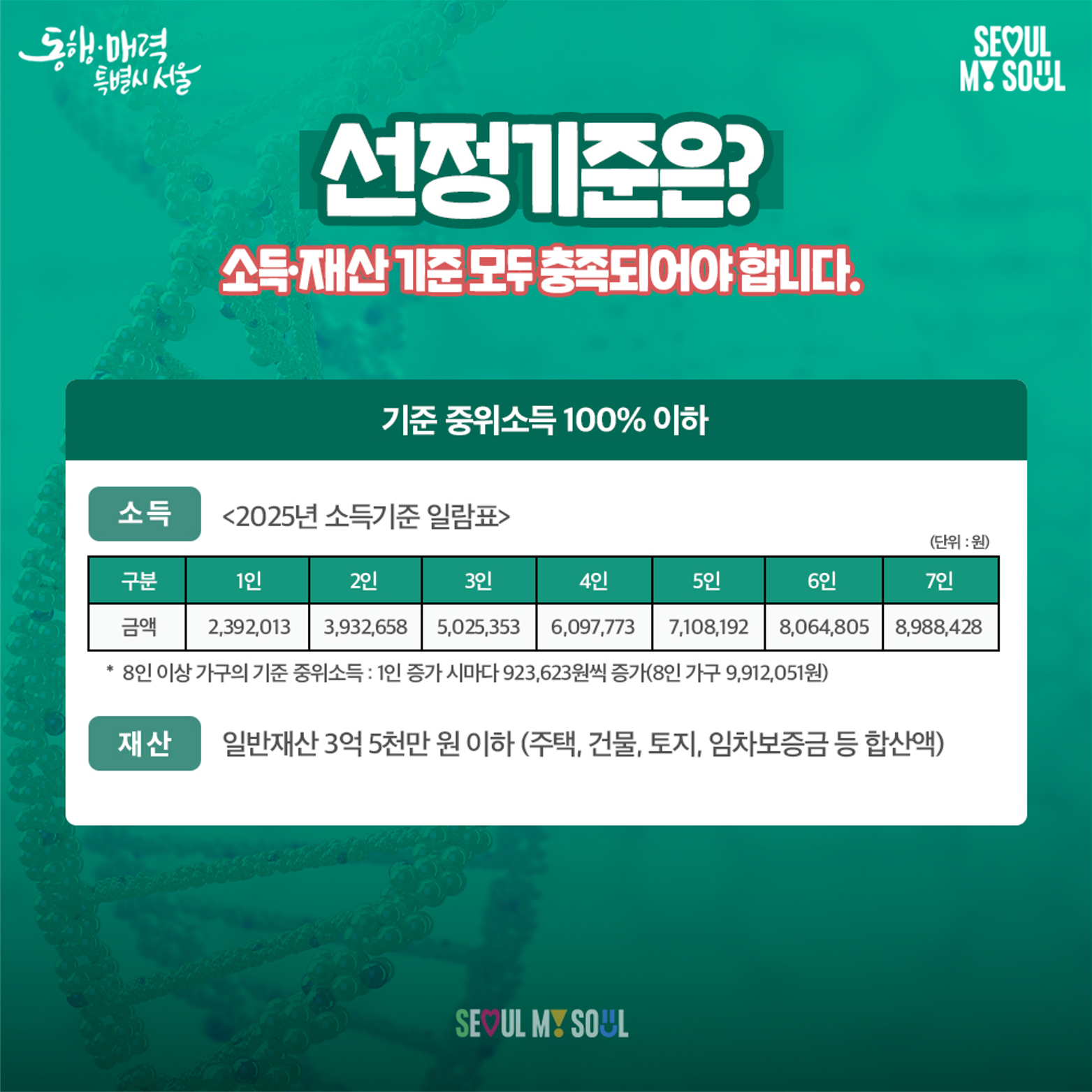 - 중복제외: 생계급여(국민기초생활보장,서울형 기초보장, 국가형·서울 긴급복지지원),실업급여, 산재보험급여 수혜자
