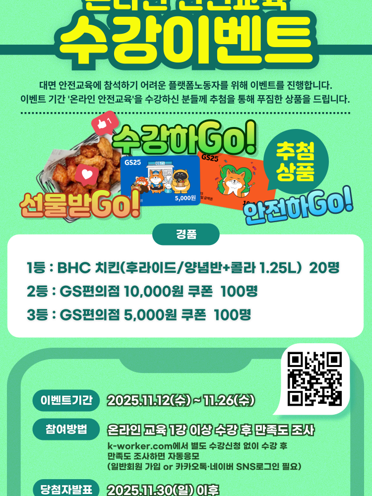 이벤트 기간 해당 '온라인 안전교육'을 1강이상 수강하신 후 만족도 조사에 응해주신분들 중 추첨하여 푸짐한 경품을 제공합니다.