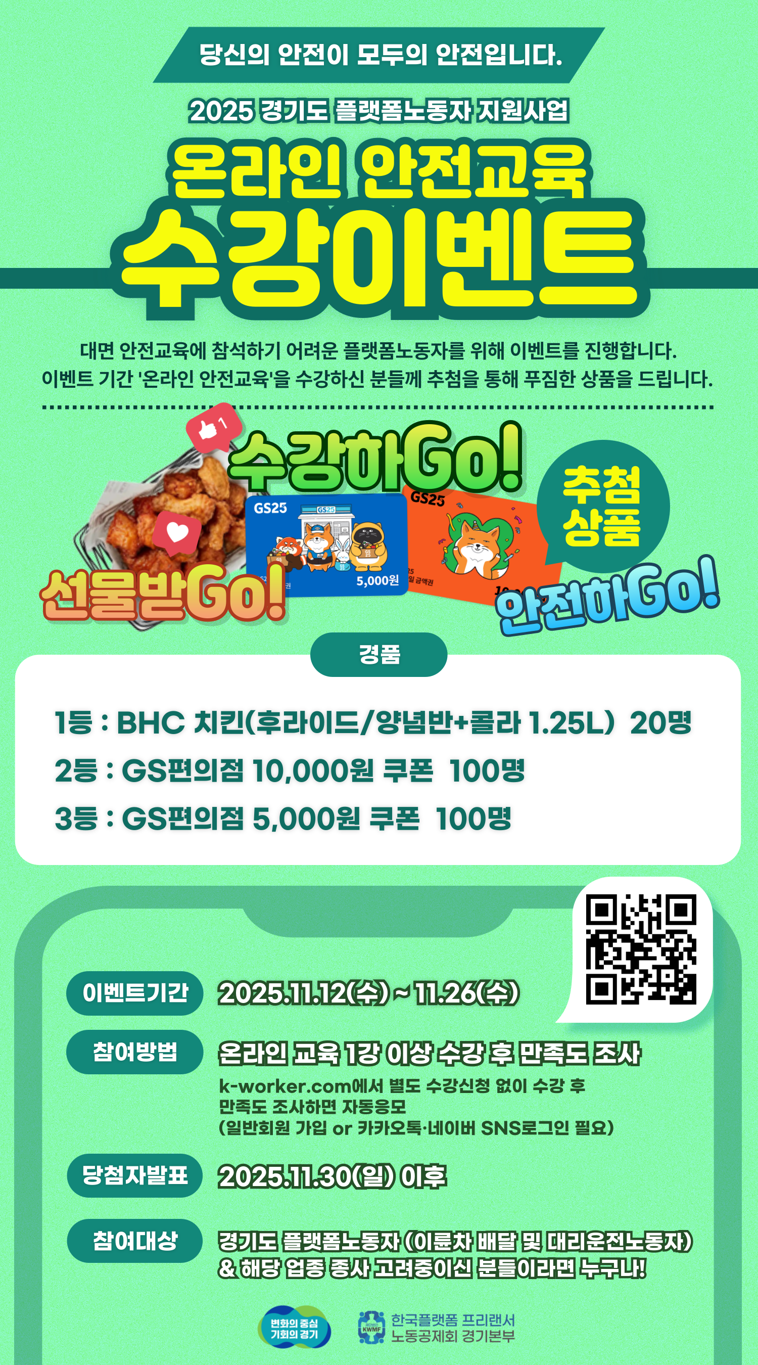 한국플랫폼프리랜서노동공제회 경기본부에서는 대면교육에 참석하기 어려운 플랫폼노동자를 위한 온라인 안전교육 수강이벤트를 진행합니다.