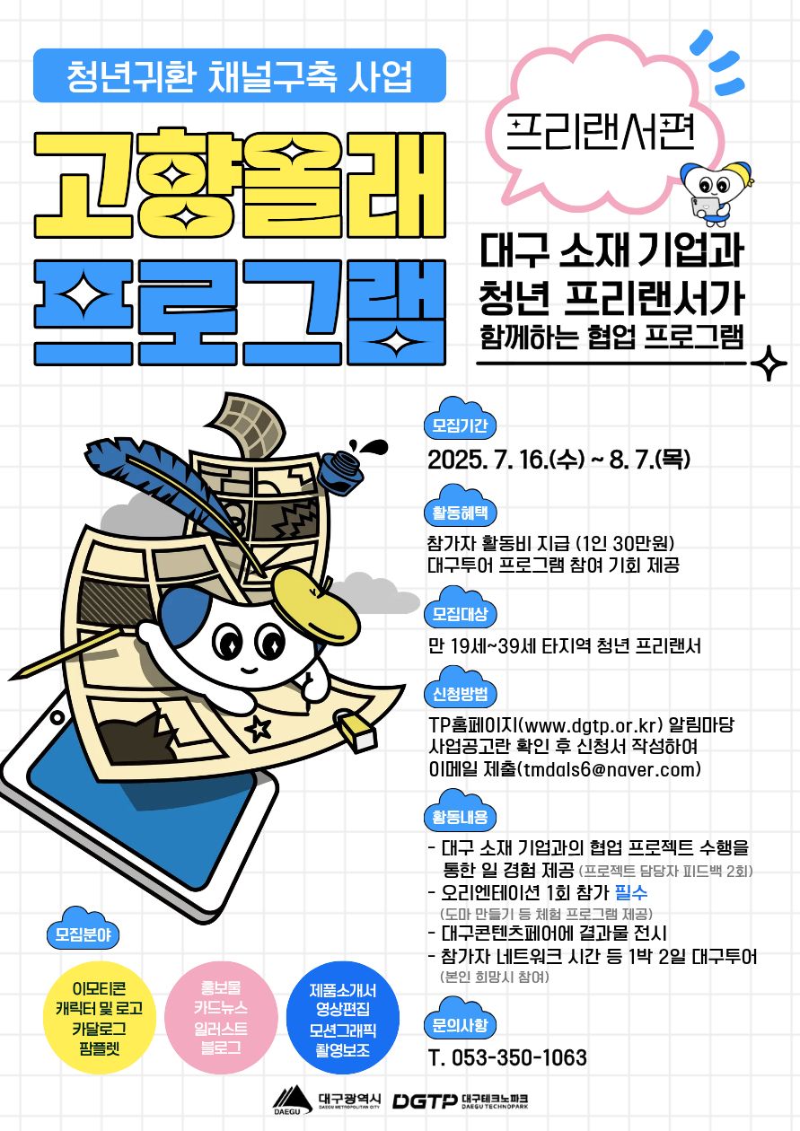 * 청년귀환채널구축사업(고향올래)_프로그램 운영, 유입경로별 지원(프리랜서 활동지원) 사업은 대구 시외에 거주중인 청년 프리랜서와 대구 소재지 기업체를 연결하여 프리랜서 청년과의 협업을 통해 나온 결과물을 9월 말에 있는 대구콘텐츠페어에 전시하는 것이 목적입니다. 프리랜서 청년들의 사업 참여로 대구시의 다양한 기업체와의 친밀감 형성 및 일 경험 제공으로함으로써 대구시에서의 취업과 프리랜서 활동을 장려하는 사업입니다.