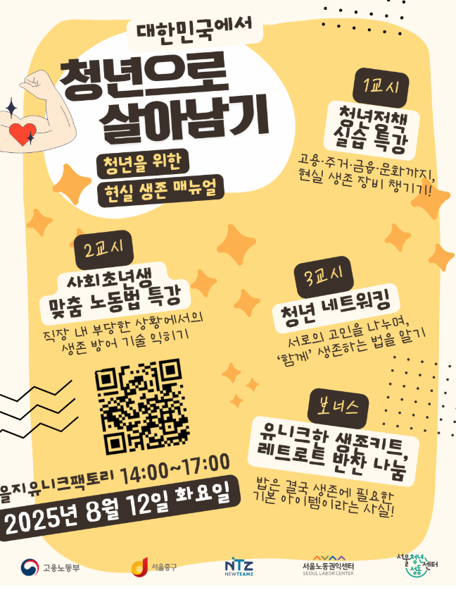 🚨 이 프로그램은 2025 중구 청년성장프로젝트의 일환으로, 고용노동부·서울시 중구의 지원을 받아 진행되며, 서울노동권익센터, 서울청년센터 성동과 함께합니다. 🤝